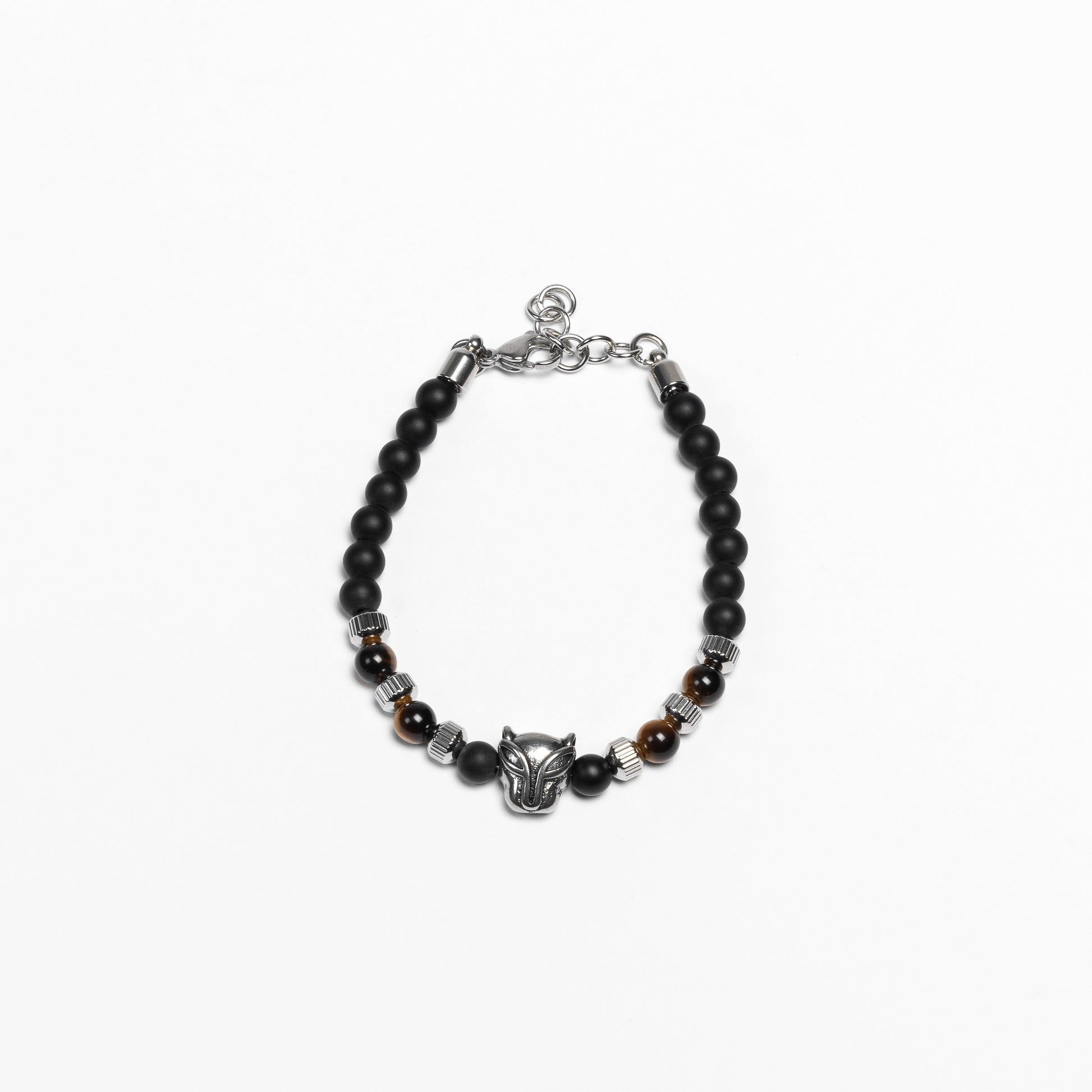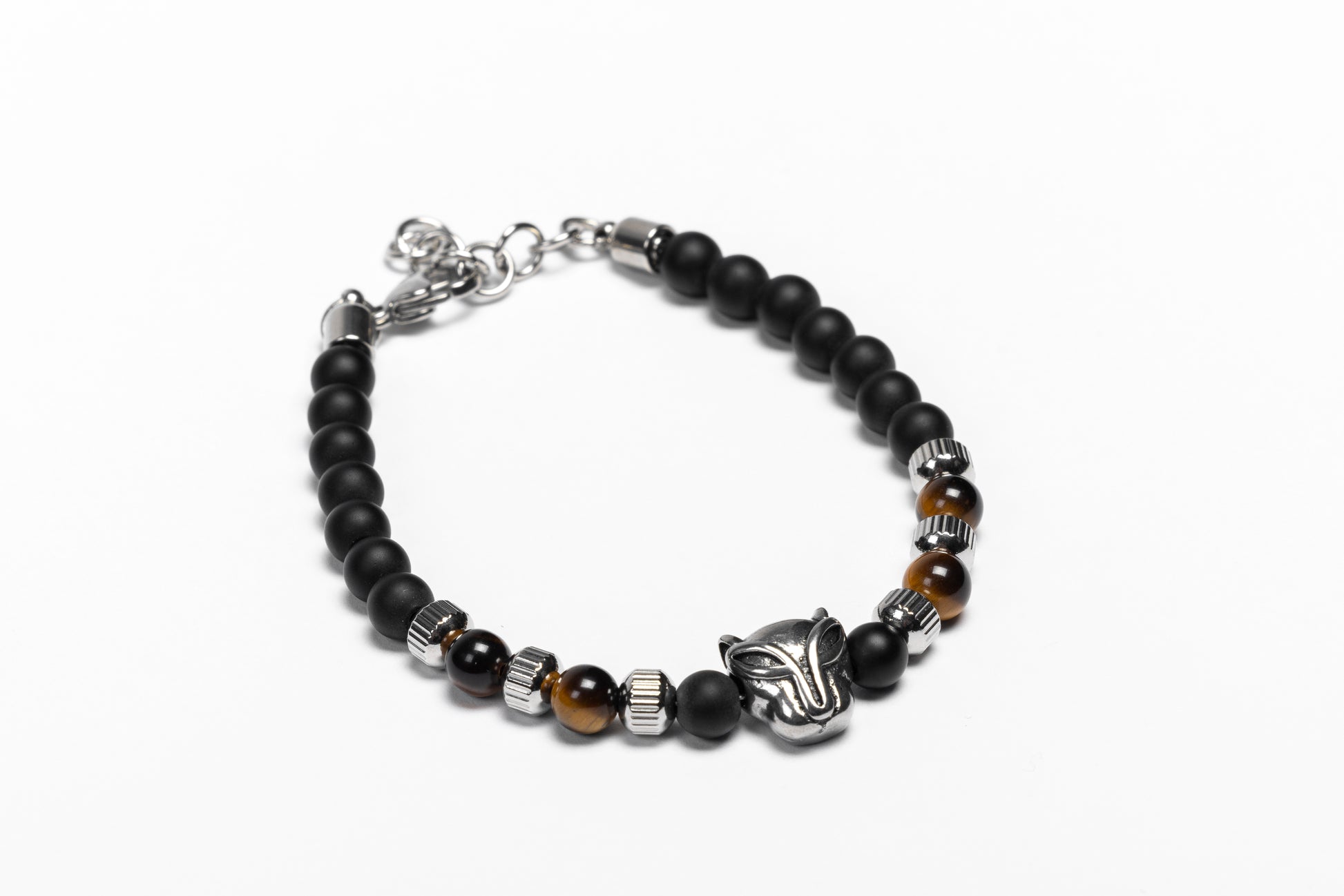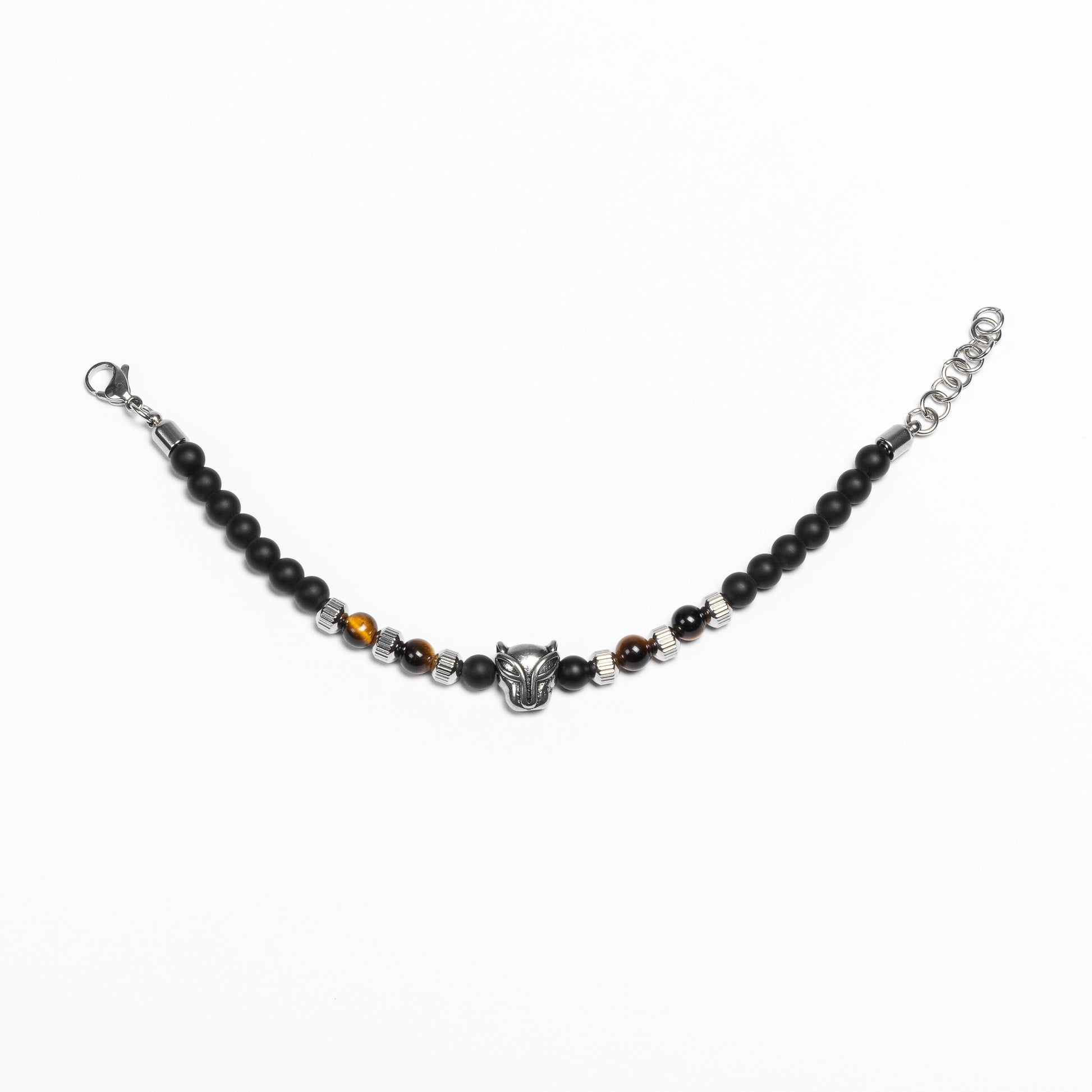 Bracciale artigianale dal design audace, con perle opache nere e inserti in occhio di tigre, arricchito da un centrale in metallo raffigurante la testa di un lupo. Simbolo di forza, istinto e libertà, il lupo rappresenta chi segue la propria strada senza paura. Le perle in occhio di tigre proteggono da energie negative e donano coraggio.